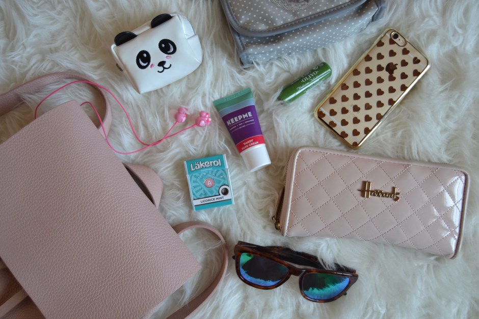 Partiamo dagli essenziali: portafoglio di Harrods acquistato a Londra 3 anni fa e devo dire che regge ancora il colpo, porta-monete a forma di panda (dolcissimo!) di H&M che ancora trovate nei negozi ed online, occhiali da sole HawkersCo (con il codice HCI20ALM potete usufruire di un 20% di sconto su tutti i modelli presenti nel sito), i miei occhiali da vista di Dior ed il mio iPhone con la cover di H&M . Ovviamente tengo entrambe gli occhiali all’interno delle loro custodie